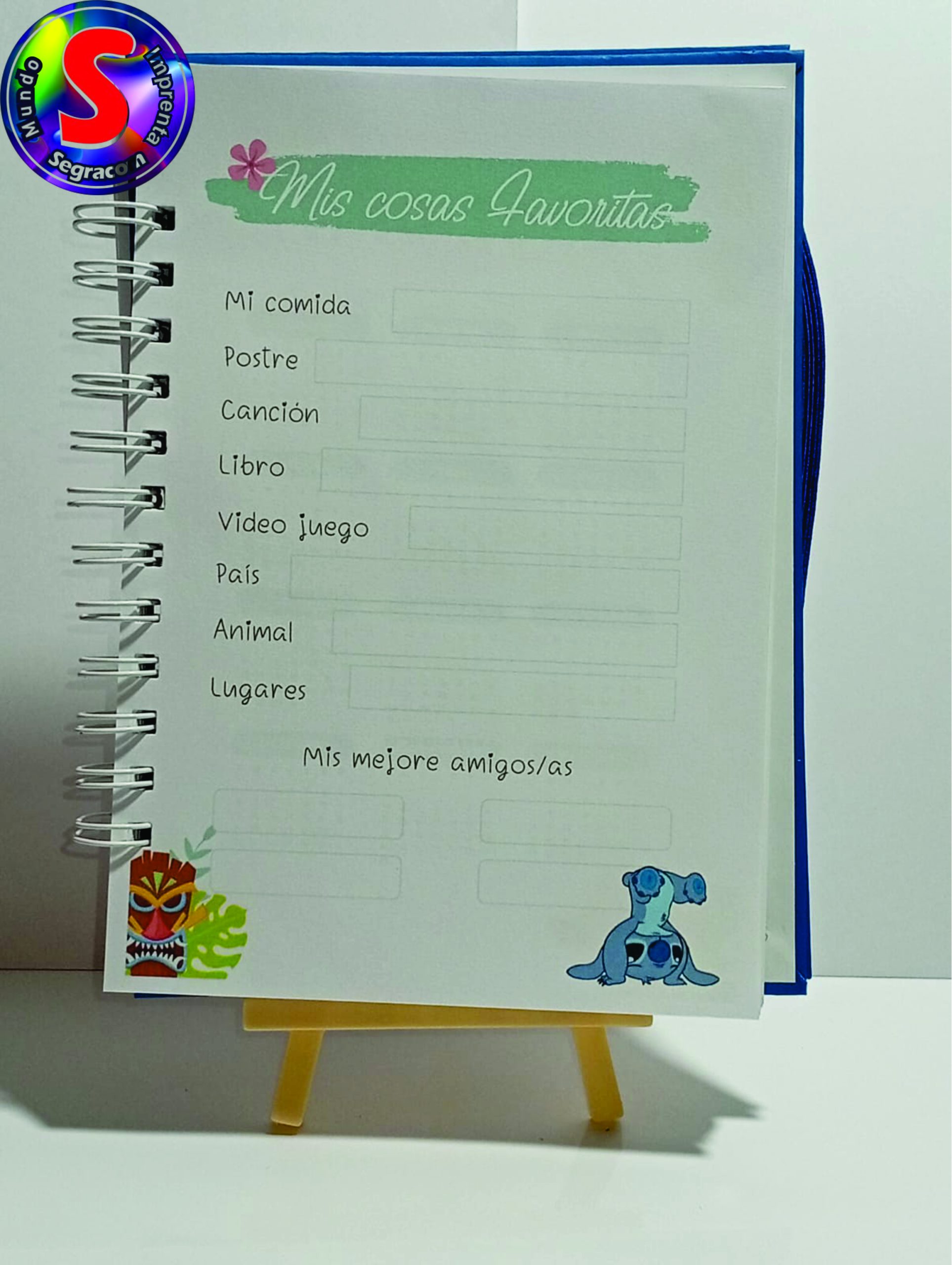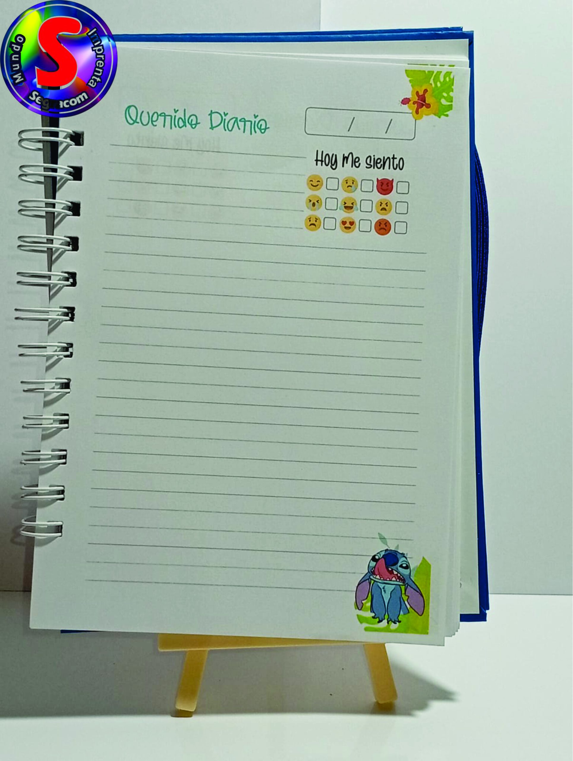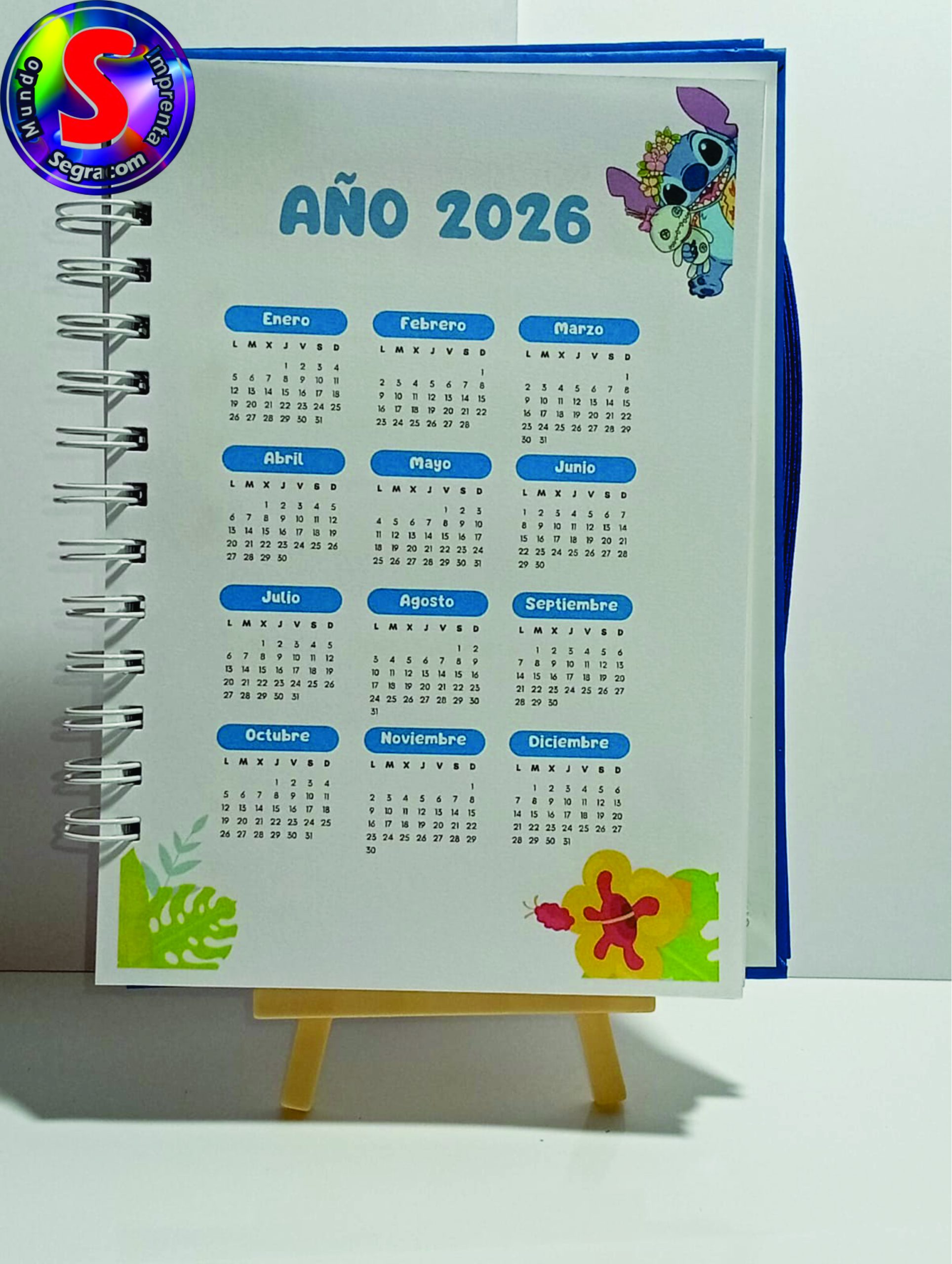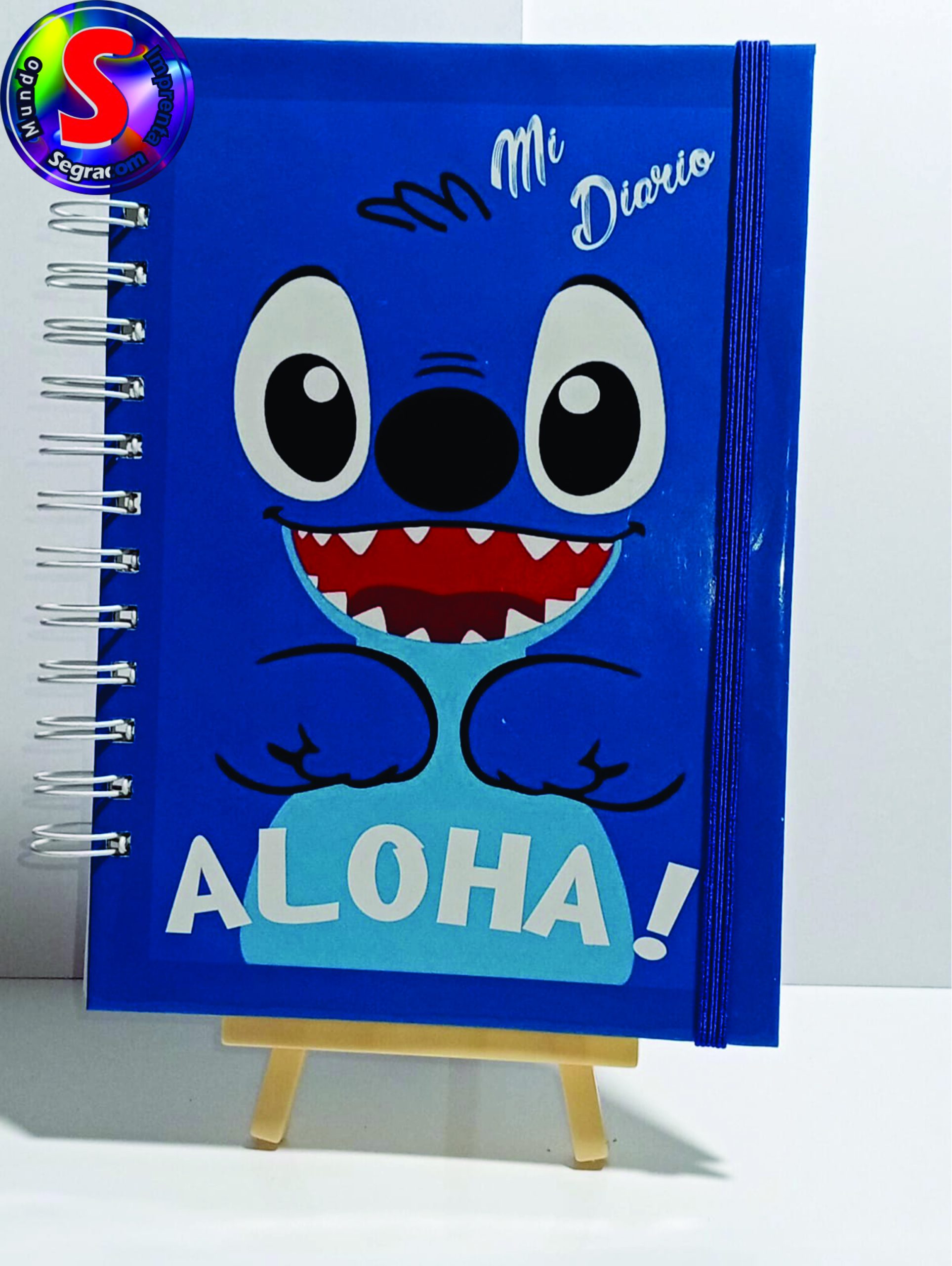 AGENDA STICH, tamaño A5 (15 X 21 cms.), 80 hojas interiores impresas a full color en papel bond de 105 grs. TAPA DURA ANILLO DOBLE CERO, CIERRE CON BANDA ELASTICA